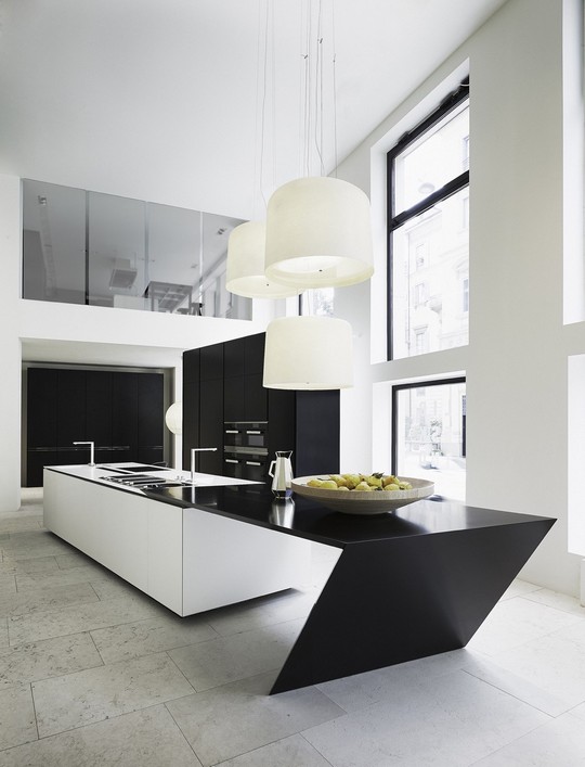 Počnimo sa nečim potpuno neobičnim. Ova kuhinja uklapa se u enterijeru jedinstveno kose arhitekture sa svojim trapezoidnim ostrvom. Rezultat je nadrealna sredina koja prostornu percepciju čini čudnom ali i lepom.