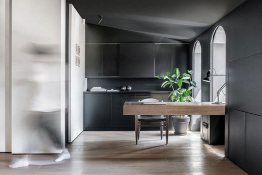 | Jedna od najvećih dilema sa kojom se arhitekte susreću jeste renoviranje starih građevina, tačnije očuvanje njihovog originalnog karaktera u bilo kojoj meri. Kad god je moguće, objekti velikog istorijskog značaja, moraju da poseduju svoju istorijsku notu, koja im ne sme biti oduzeta zbog toga što automatski gube svoj karakter. Isto je i sa enterijerima, a pravi primer predstavlja stan u Kijevu, nedavno renoviran za mladog profesionalca, koji je želeo da istakne njegov idalan balans između starog i novog. Cilj kompanije 2B.group uključivao je upotrebu originalnih materijala zgrade u kojoj se stan nalazi, u svrhe pozadina koje oblikuju i teksturno akcentuju njegov enterijer. Sačuvani su originalni zidarski radovi skriveni iza slojeva gipsa starih drvenih spojeva greda na plafonima i niskih zidova potkrovlja. Diskretne palete sastavljene od crne, bele i sive boje, odabrane su za sve arhitektonske zahvate kako bi se harmonično uklopile sa ostatkom očuvanih materijala ove građevine. Za donji nivo, sastavljen od dnevne sobe, kuhinje i trpezarijskog dela u otvorenom planu prostora, beli zidni paneli ujedinjuju i osvetljavaju prostor bez kompletnog zatvaranja starih karakteristika i originalnih zidarskih radova. Tamni tonovi potkrovlja uslovljeni su metalik stepeništem, konstrukcijom i otvaranjima prozora sa donjeg nivoa, ali prate i dizajn nekoliko komada nameštaja, pokućstva i osvetljenja, postavljenih u čitavom enterijeru. Minimalistički dekor elegatnih nijansi i čistih linija, uklapa se u kompleksnost arhitektonskih segmenata projekata, kao što je ugradnja novih prozorskih okana skrivanih u panelima zidova u potrkovlju, sastavljanja konstrukcije stepeništa, postavljanje zvučne izolacije u gostinjskom kupatilu, smeštenom između dnevne sobe i trpezarijskog dela. Izvor: DigsDigs / mojenterijer.rs |