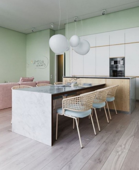 Nežni tonovi odabranih boja odličan su primer kako da uredite stan u smirenim tonovima, ali sa dovoljno boja da ne deluje ni dosadno ni sumorno. Bojite se da eksperimentišete sa jakim bojama u stanu? A želite da izbegnete dosadnu belu ili bež nijansu za zidove ili nameštaj? Evo kako možete da uredite svoj stan da izgleda prostrano i svetlo, ali da ima dovoljno boja koje će ukućane ispunjavati vedrinom i spokojem. Projekat za ovaj sjajno uređen trosoban stan potpisuju arhitekte Ruslan Kovalchuk i Stephen Tsimbalyuk, a na nezaboravan način kombinuje 3 pastelne boje: bebi roze, nebo plavu i mint zelenu. Utisak izuzetno svetlog stana čiji projekat je pripremljen za dizajn studio Artpartner pojačan je i ogromnim oknima od poda do plafona, kao i oblaganjem poda laminatom u dezenu svetlog drveta. Obratite pažnju i na velike slike na zidu dnevne sobe koje motivom oblaka kao da multiplikuju pogled kroz raskošne prozore. Igra pastela nastavlja se i u izboru nameštaja: bledoroze garnitura za sedenje, svetloplave zavese i tepih, bela kuhinja i svetloplava sedišta na trpezarijskim stolicama, ružičasta draperija u gostinskoj sobi, plavosivo uzglavlje u spavaćoj. Zahvaljujući rustičnim materijalima kao što su drvene grede i prostirke sa krupnim uzorkom i neobično izloženim sportskim rekvizitima (bicikl, gimnastički kolutovi), pri ovom pomalo riskantnom kombinovanju boja izbegnut je kič i "presladak" utisak. Izvor: lepaisrecna.rs/moj-stan |