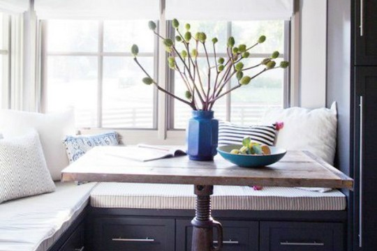 | Probajte da balansirate između modernog i rustičnog, na taj način ćete ostavriti potpuno zadovoljavajući prostor za uživanje. Možda nije vaša prva pomisao, ali siva boja je odlično rešenje za cozy atmosferu. Mnošto i mnoštvo neutralnih tonova - od zavesa, preko nameštaja do najsitnijih detalja. Boja koja se usko vezuje za trpezariju jeste plava. Tako da ne bi bilo loše da imate po neki detalj ove boje, recimo, keramičku vazu, ili nešto slično tome. Neka vaša trpezarija dobije dušu, tako što ćete je ukrasiti umetničkim delima. Osvetljenje igra ključnu ulogu. Ako već nemate prozore od plafona do poda, onda se postarajte da imate makar nameštaj svetlije nijanse. Centralni deo trpezarije može da zauzme neko nesvakidašnje umetničko delo. Rustičan drveni sto bi svaki dom trebalo da ima. I boja poda bi trebalo da bude svetlije nijanse. Photo: Decoholic.org |