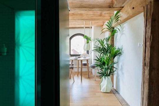 | Smešten u istorijskom srcu Torunja, - prelepo očuvanog srednjovekovnog grada u Poljskoj koji je uvršten na UNESCO listu svetske baštine, ovaj stan je neverovatan savremeni prostor sa mnogo stila. Projektovao ga je poljski arhitekta Paveł Tatara i arhitektonska praksa Znamy Się, i ovaj projekat postavlja važno pitanje: kako pomiriti potrebu za savremenim stanovima sa imperativom očuvanja gradske baštine? Matrica okruglih prozora, koja je nekada služila za utovar i istovar vreća pšenice u skladište, prožima zgradu poput bajke, akcentovanom crvenom ciglom i zabatnim krovom. Arhitekte su prihvatile boju i pojačali prostor uvođenjem jedinstvenih detalja i nijansi, posebno u dizajnu kupatila. Zamišljen kao monohromatska čelična kocka i postavljena u sredini stana, kupatilo služi nekoliko svrha, uključujući kao tampon između dnevnog boravka i spavaćeg prostora, i kao savremene element usred stare arhitekture drvenih greda, okruglih prozora i debelih masivnih zidova. Uvođenje kupatila kao zasebnog volumena pruža mogućnost prilagođavanja a, njegov živopisni ton koji je u suprotnosti sa neutralnom paletom belog i prirodnog drveta dolazi do izražaja. Štaviše, svaka kocka ima jedinstveni prozor od vitraža do poda čiji je dizajn inspirisan istorijom grada. U apartmanu broj 2, na primer, dizajn se odnosi na trostrani svod koji se nalazi u katedrali u Torunju, dok je stan broj 4 omaž gotici. Grafički dizajn vitraža ne samo da dodaje suptilnu dekorativnu notu već i omogućava prodor prirodnog svetla u kupatilo. Dnevni boravak je uređen sa sivim tapaciranim nameštajem, zelenilom i drvenim gredama na plafonu dok se trpezarijska zona nalazi pored prozora i deo je dnevnog boravka, a šareni blok desno je kupatilo. Kuhinja je urađena u beloj boji, sa jednostavnim pločicama i elegantnim belim ormarićima i mat radnim površinama. Spavaća soba se nalazi na gornjem spratu, sa krevetom i mini kućnom kancelarijom. Izvor: Yatzer